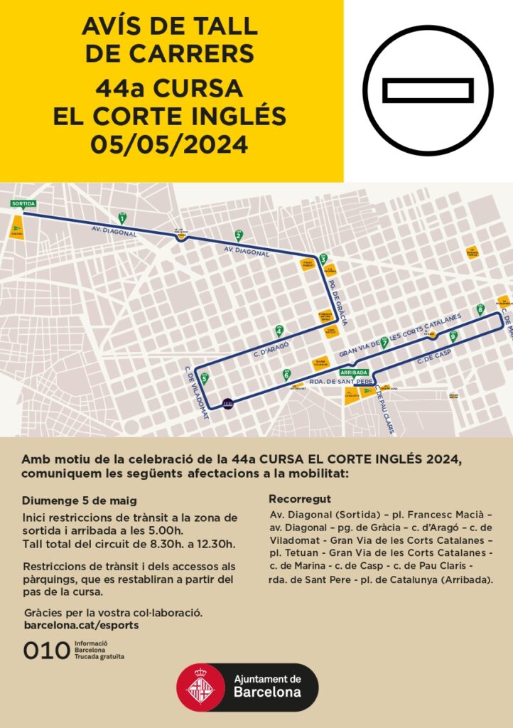 La salida será a las 9.00 h en avenida Diagonal, justo delante de El Corte Inglés Diagonal, pasando por Francesc Macià y la plaza de Cinc d’Oros hasta llegar a Paseo de Gràcia. Bajará el paseo hasta girar por la calle Aragó y volverá a girar en la calle Viladomat siguiendo por la Gran Via hasta la calle Marina. Este año hay un pequeño cambio, se seguirá por la calle Casp, hasta llegar a la meta en Plaza Catalunya.